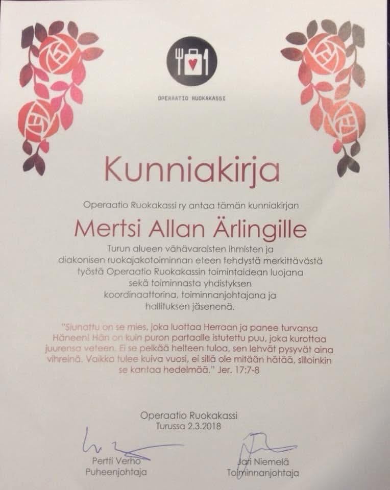 Kun Operaatio Ruokakassin hallitus kutsui minut kunniajäseneksi, liikutuin syvästi. He sanoivat: "Idea lähti sinun ajatuksestasi, ja olet tehnyt merkityksellistä työtä koko ruoka-avun kentän eteen." Se oli kuin Jumalan allekirjoitus sille ruutuvihkoon piirretylle idealle.