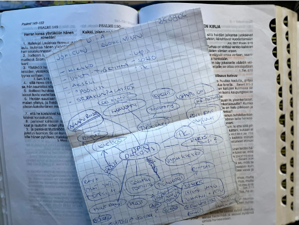 Raamatun välistä löysin ruutuvihon, johon aloin piirtää hahmotelmaa. Hetkessä syntyi mind map, joka oli enemmän kuin pelkkä kaavio. Ymmärsin, että Jumala oli laskemassa sydämelleni ihmistä suuremman unelman. Aluksi ajattelin sen koskevan vain Varissuon aluetta, mutta pian tajusin, että kysymys oli jostakin paljon laajemmasta. Siitä syntyi Operaatio Ruokakassin toimintamalli.